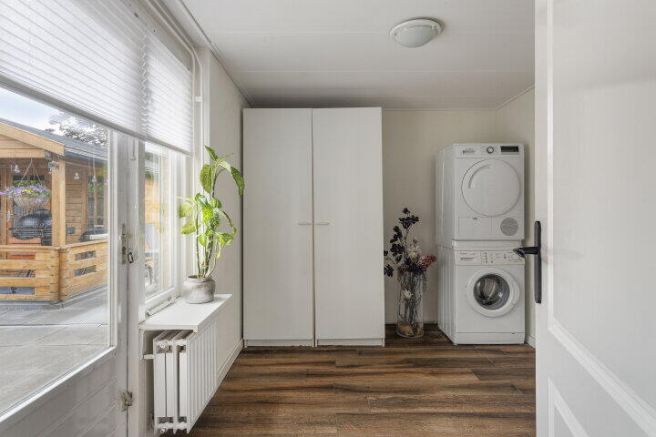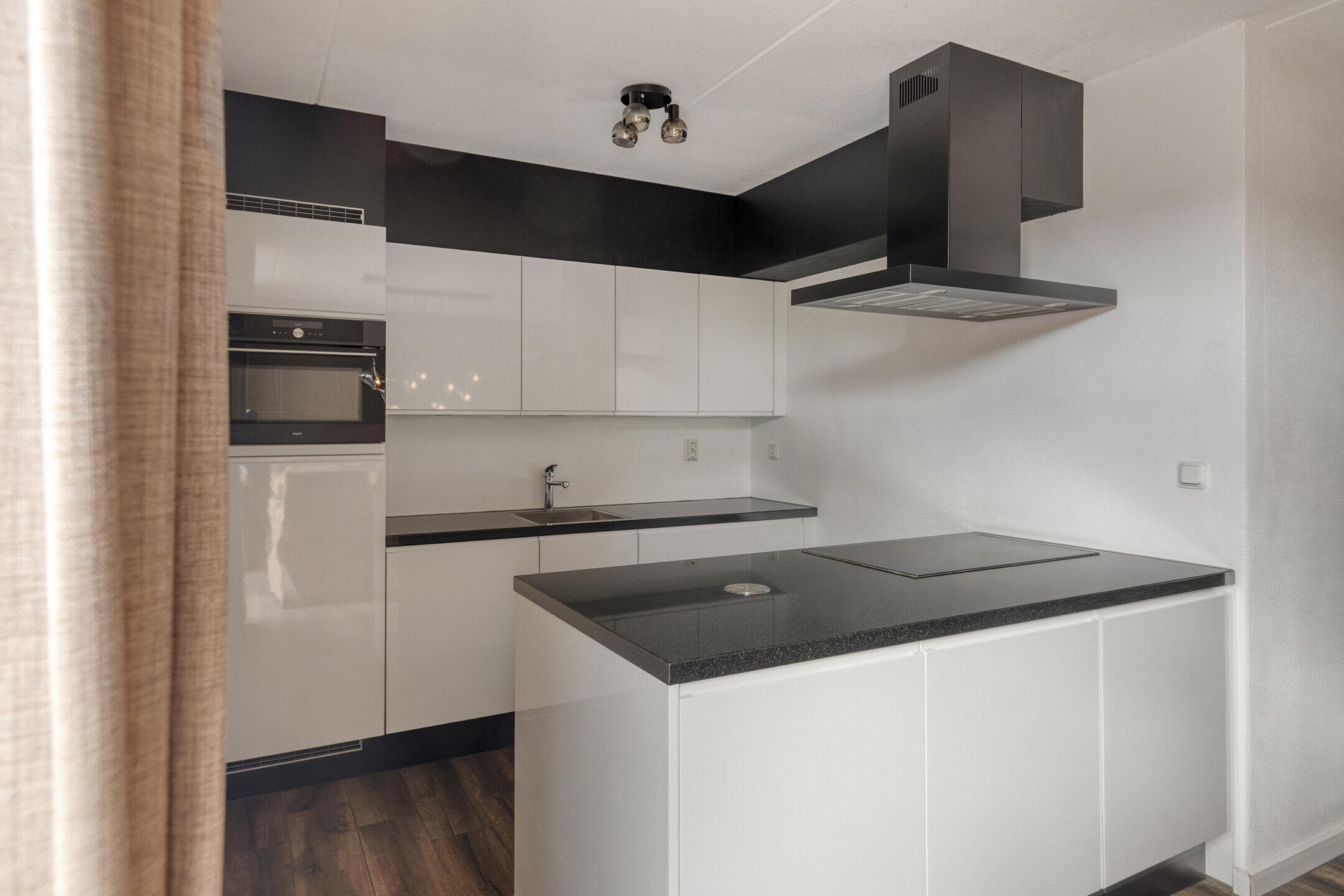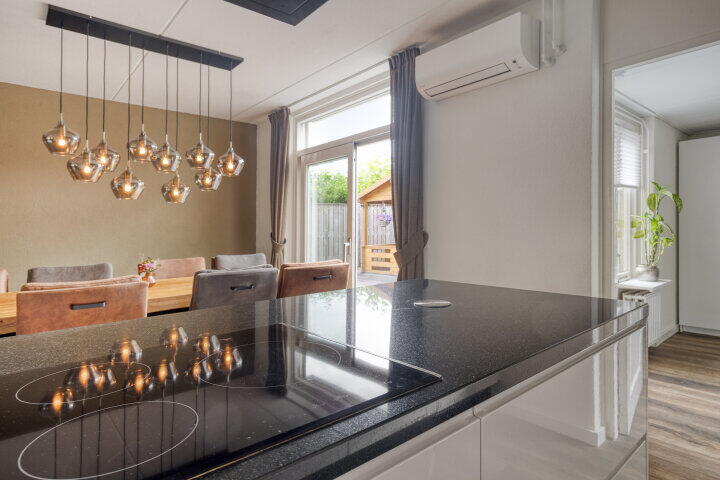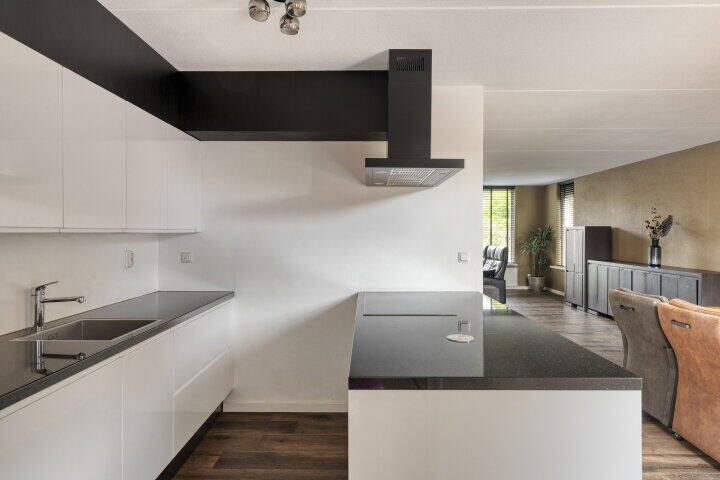 De woonkamer heeft een warme uitstraling. Is voorzien van laminaatvloer, airco, vloerverwarming en een sfeervolle gashaard. De eethoek grenst direct aan de schuifpui naar de tuin, waardoor binnen en buiten mooi in elkaar overlopen. De strakke witte hoogglans keuken is voorzien van alle gemakken: vaatwasser, combi-oven, inductiekookplaat en een kookeiland. Vanuit hier heb je toegang tot de praktische bijkeuken met plek voor wasmachine, droger, extra opbergruimte én een deur naar de tuin.