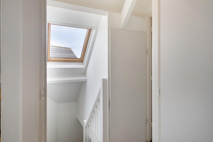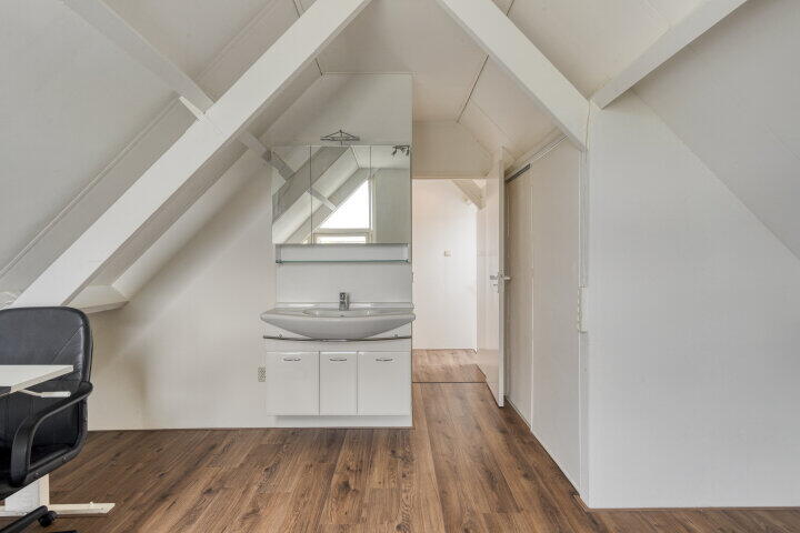 Op de eerste verdieping bevinden zich drie lichte slaapkamers met strakke wanden en laminaatvloer. De overloop is uitgerust met airco en een vaste trap naar de tweede verdieping. De moderne badkamer is voorzien van lichte tegels, badkamermeubel, toilet, inloopdouche en vloerverwarming.