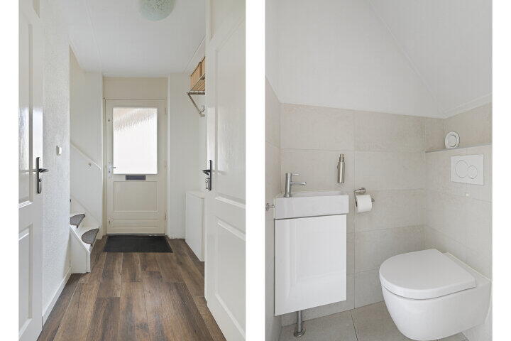 Via de lichte hal met trapopgang en toilet kom je binnen in een huis waar warmte en sfeer de boventoon voeren.